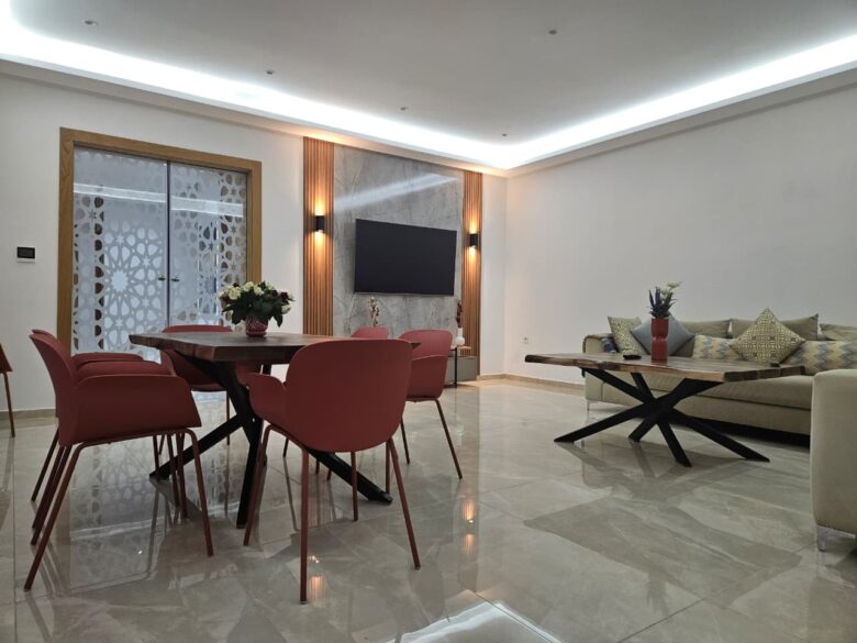 A spacious living area featuring modern décor, a stylish dining table, and cozy seating. Perfect for family meals, gatherings, and creating lasting memories together.